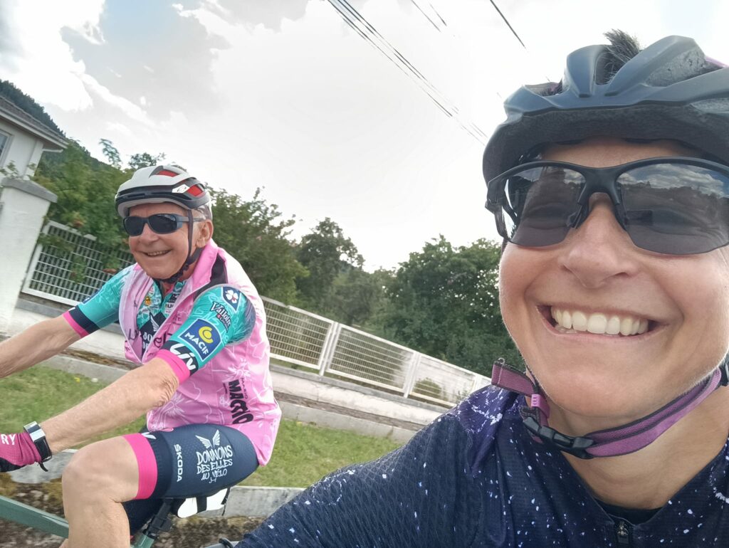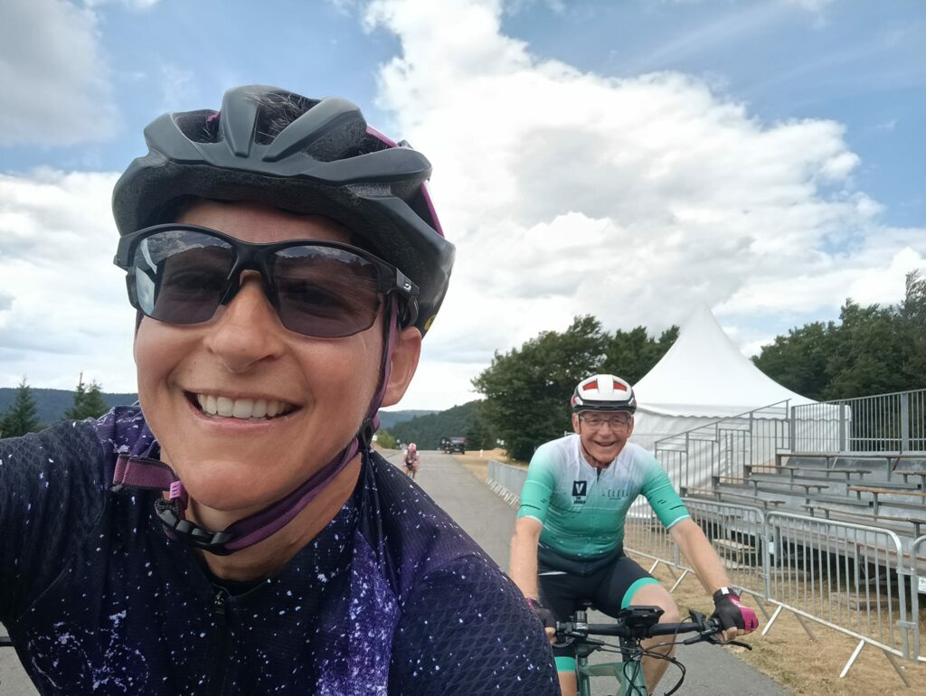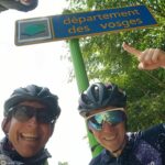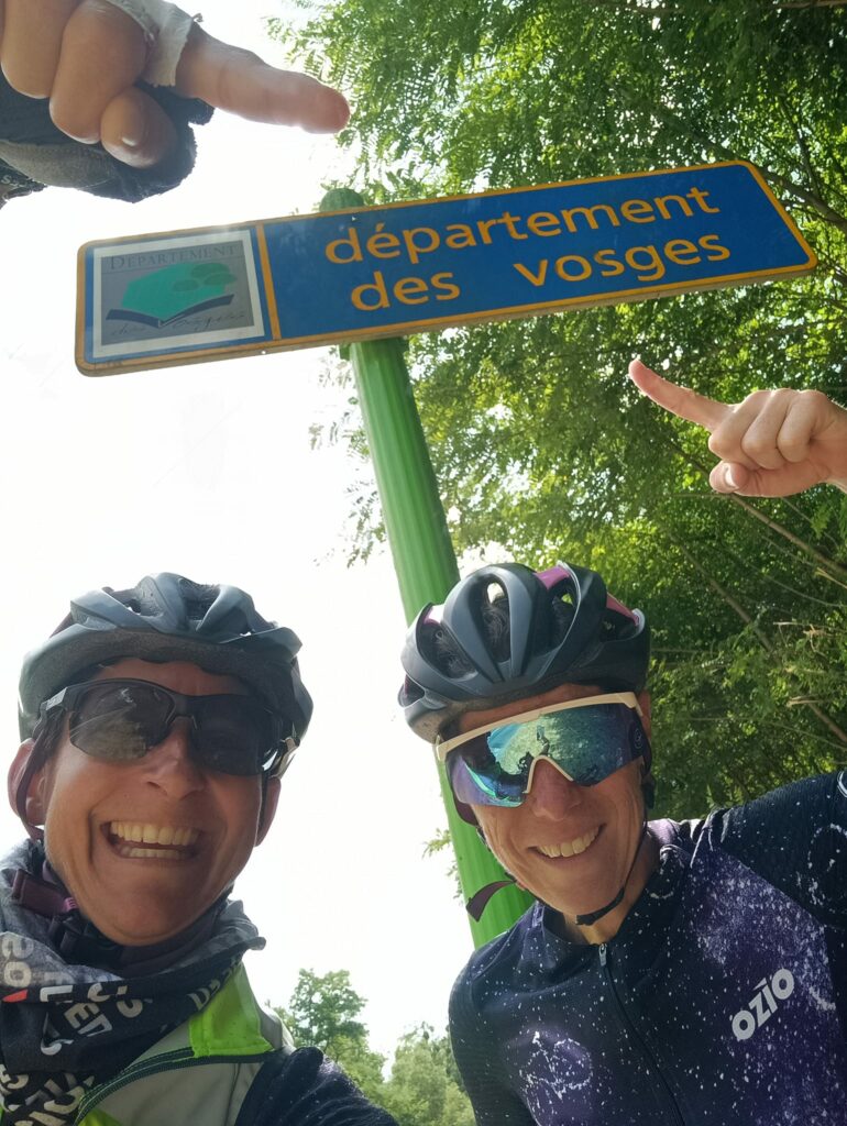 Après un moment reposant et requinquant, les voilà reparties en direction des Vosges. Et en passant le panneau « Bienvenue dans les Vosges » Aline est euphorique, elle est chez elle. Elle scrute l’horizon … et à 15km de l’arrivée, elle aperçoit son père en vélo venu à leur rencontre : 2ème émotion de la journée !
