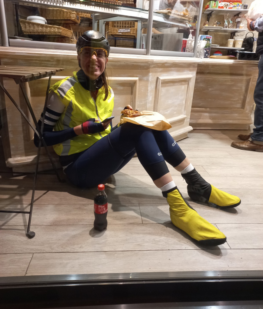 « Pour la nourriture, nous avions prévu de nous arrêter dans quelques boulangeries pendant la journée, mais nous avions quand même besoin de suffisamment d’énergie sur le vélo et pour la nuit. J’ai pris plusieurs barres énergétiques et quelques gels de secours (que je n’ai pas utilisés). J’ai rempli une bouteille de boisson énergétique, une de Concap et une autre d’eau. J’ai aussi pris deux bananes, du pain d’épices et un sandwich au fromage pour la nuit. Il me restait de la nourriture à la fin, donc tout s’est bien passé !