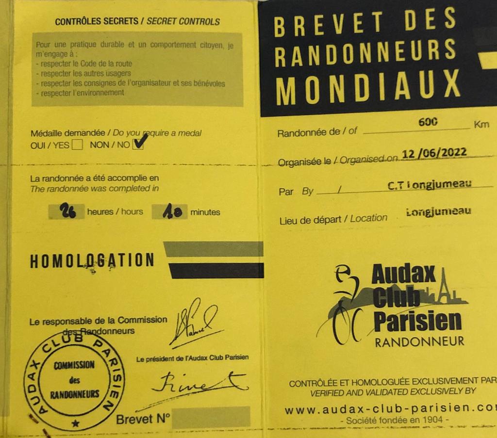 Et bien après avoir validé son BRM400 (lire l’article BRM400 – validé), Annemiek a validé son brevet de 600 kms, le 12 juin à Longmeau. Ceci lui a permis de valider sa pré-inscription à « Paris-Brest-Paris de 2023 » qui aura lieu du dimanche 20 au jeudi 24 août 2023.